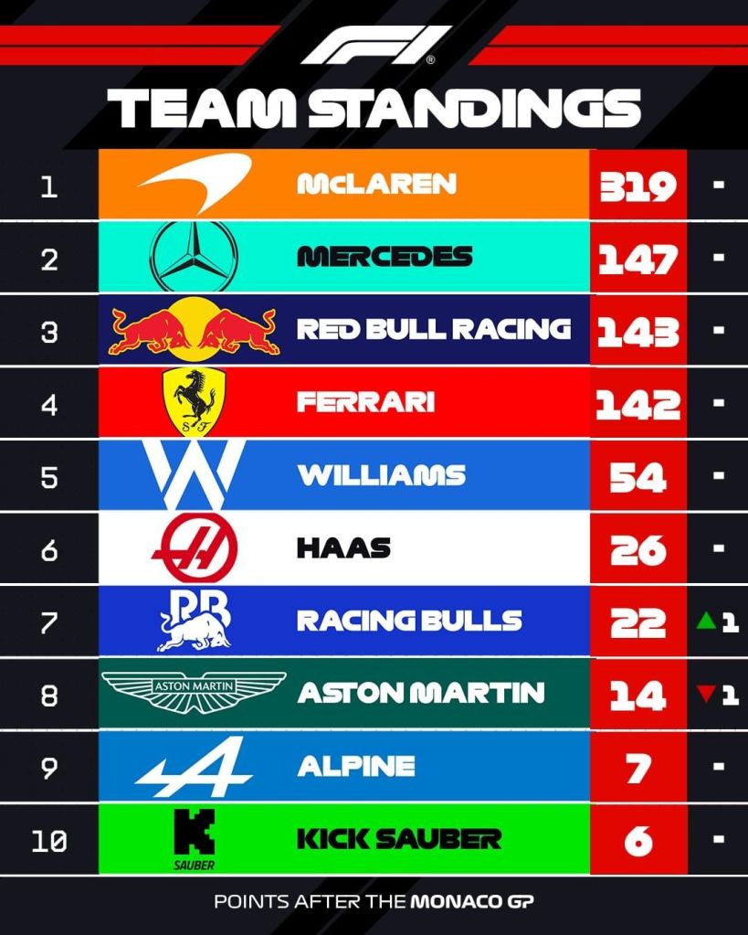 Outro destaque, a estratégia louca da Williams para colocar os dois carros na zona de pontuação. Aproveitando-se do fato que a pista quase não permite ultrapassagens, a Williams fez um jogo incrível de equipe. Sainz e Albon revezaram na missão de segurar o pelotão para eles cumprirem os dois pits obrigatórios. Estratégia que deu certo, levando a equipe a atingir o objetivo, e deixando os pilotos da Mercedes, que vinham logo atrás, revoltados. Lawson e Hadjar, da Racing Bulls, também seguiram a estratégia de segurar o pelotão, e também pontuaram.