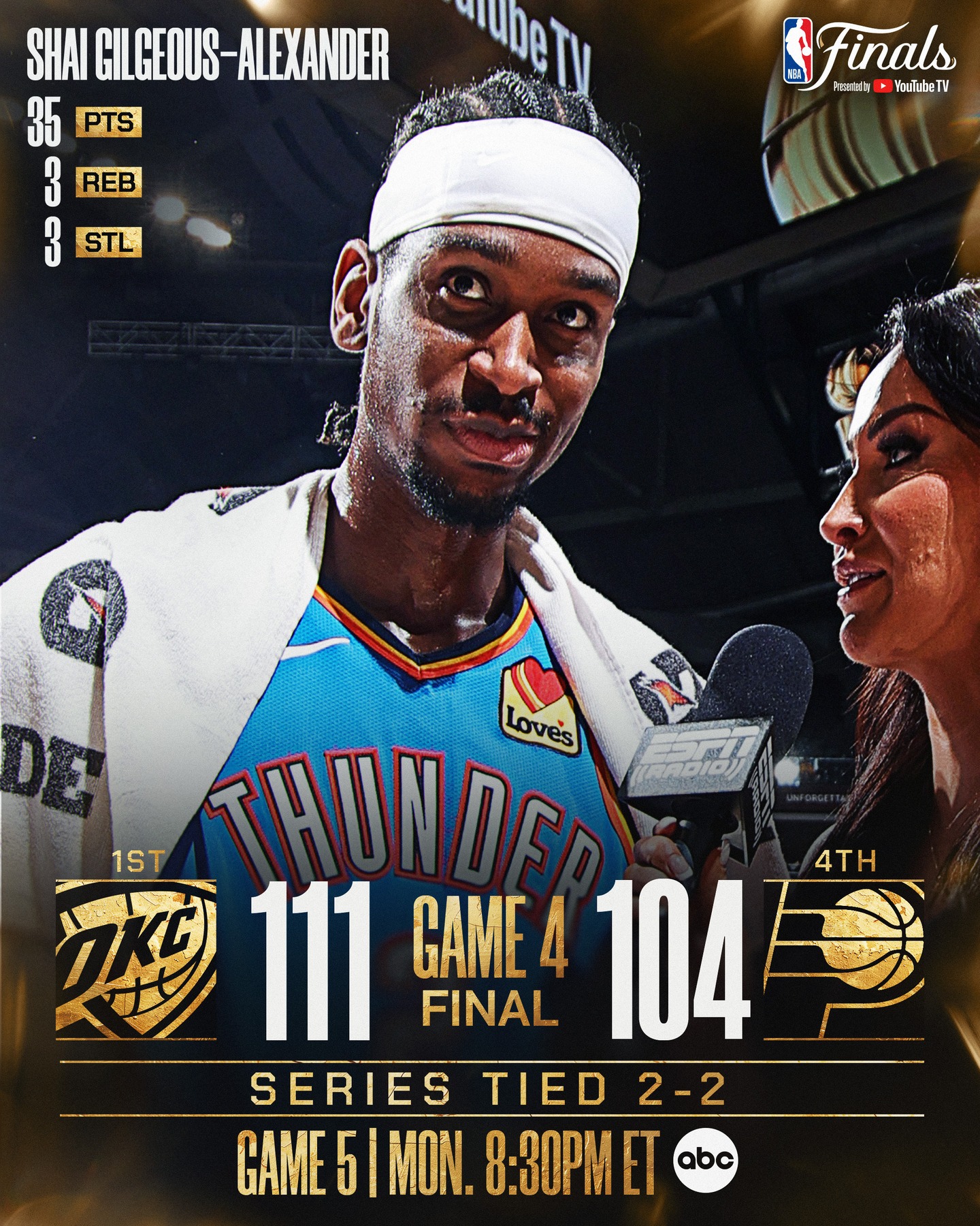 Durante todo o jogo, os Pacers tiveram o controle da partida. Apesar da diferença mal chegar à 10 pontos, os Pacers estavam jogando em casa, e sempre à frente, tudo indicava que os liderados por Siakam, principal nome do jogo até o terceiro período, iriam fazer o 3×1 na série, e fica muito próximo do título inédito da NBA. Entretanto, com um último período espetacular, os Thunder conseguiram a virada e sair de Indiana com a série empatada.