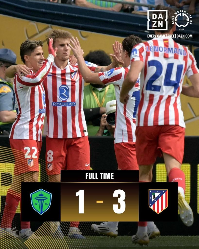 Aqui não teve zebra, apesar do esforço do Atlético de Madrid em perder gols no primeiro tempo. Depois de ser goleado na estreia pelo PSG, os colchoneros não vacilaram contra os americanos do Seattle sounders. Vitória tranquila, garantida, praticamente, no início do segundo tempo. Agora o time da Espanha vai para o tudo ou nada contra o Botafogo para buscar um lugar nas Oitavas, já o time estadunidense dá adeus à competição, indo para a última rodada apenas apanhar… ops cumprir tabela contra o PSG.