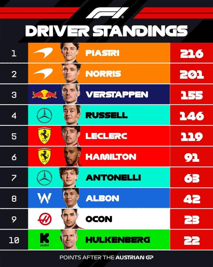 Logo após a largada, que foi atrasada devido a um problema no carro de Sainz, Oscar Piastri grudou em Norris. Aliás, na largada, Antonelli acertou em cheio o carro de Verstappen, tirando ambos na prova. Até o primeiro Pit Stop, Piastri “fungou no cangote” de Norris, a ponto até de ultrapassar por alguns segundos, o companheiro. Sem a barbeiragem do Canadá, Norris recuperou e não saiu mais da ponta. Para evitar problemas, como no Canadá, a McLaren utilizou do Pit Stop para distanciar Norris de Piastri. Ainda sim, no fim da corrida, na última volta, só não houve um novo embate, pois os carros da McLaren ficaram no meio da disputa de posição entre Bortoletto e Alonso. LeClerc, de camarote, fechou o pódio.