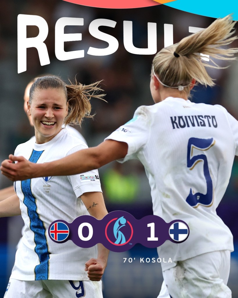 Porém, no início do segundo tempo, Antonsdóttir foi expulsa, deixando a Islândia com uma à menos. A Finlândia tentou se aproveitar dessa vantagem, e conseguiu. Kosola, aos 25 do segundo tempo, abriu o placar, marcando o primeiro gol da Euro Feminina 2025.
