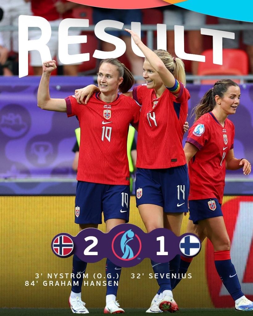 Com menos de 2 minutos, a Noruega abriu o marcador, com um gol contra de Nyström. Depois disso, as favoritas tiveram o domínio do jogo e diversas chances de ampliar o placar. Entretanto, até a trave não permitiu. Logo o mantra ecoou e perto do fim do primeiro tempo, Sevenius empatou com um golaço. Após o gol finlandês, o primeiro tempo ficou protocolar, sem grandes chances para ambos.