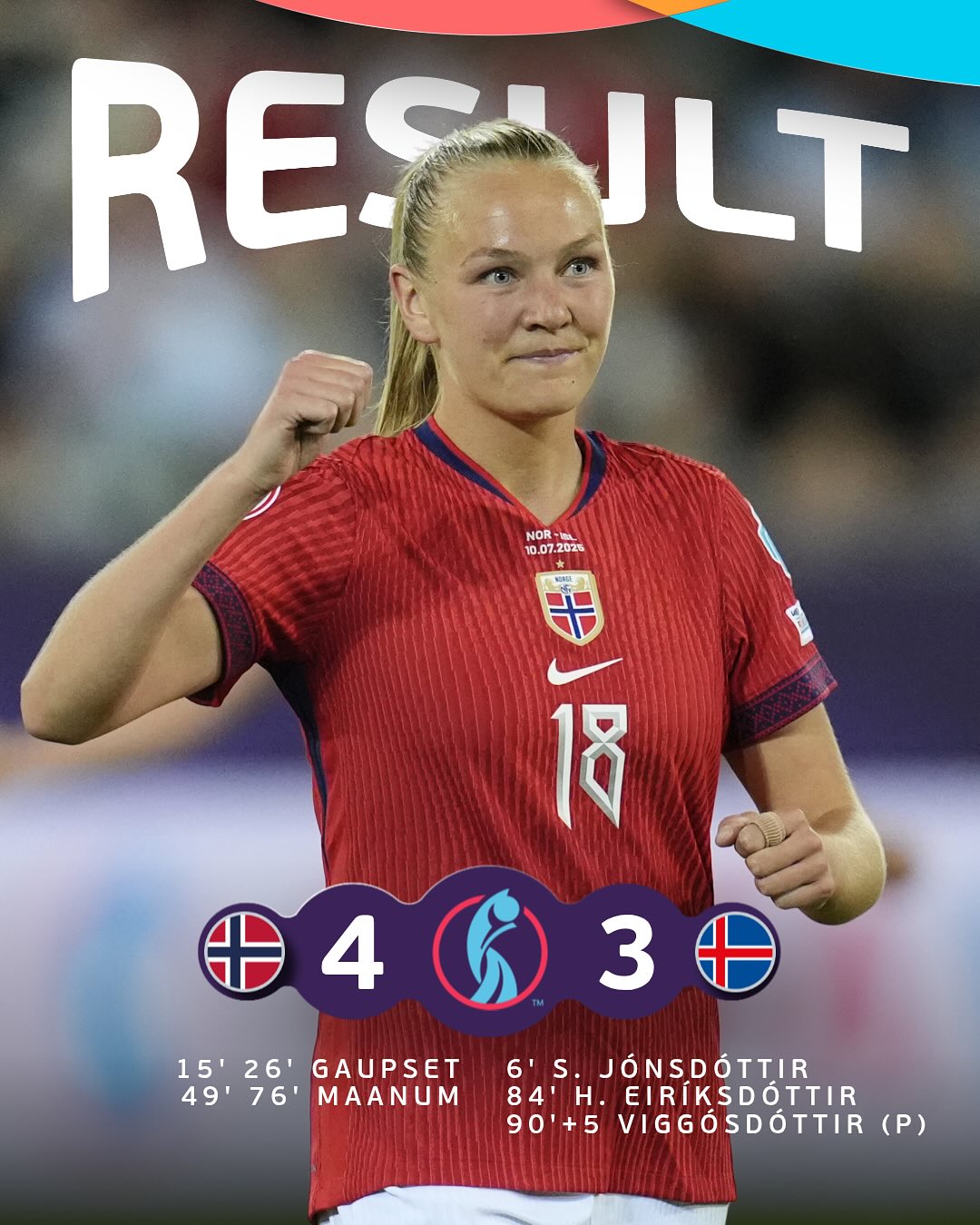 Apesar de tomar um gol de Jonsdottir, da Islândia, com menos de 10 minutos, a Noruega não se desesperou e mostrou porque é era a grandona do grupo. Gaupset, 20 minutos após o gol islandês, balançou a rede duas vezes e já ali garantiria a vitória norueguesa, ainda no primeiro tempo. No segundo tempo, foi a vez de Maanum balançar as redes duas vezes, e até ali, garantir uma bela goleada norueguesa por 4×1. Mas a Islândia foi valente, lutou para tentar seu pontinho na Euro, e antes do jogo terminar, fez seus gols com Eiriksdottir, próximo dos 40 minutos, e de pênalti com Viggosdottir, já aos 50.