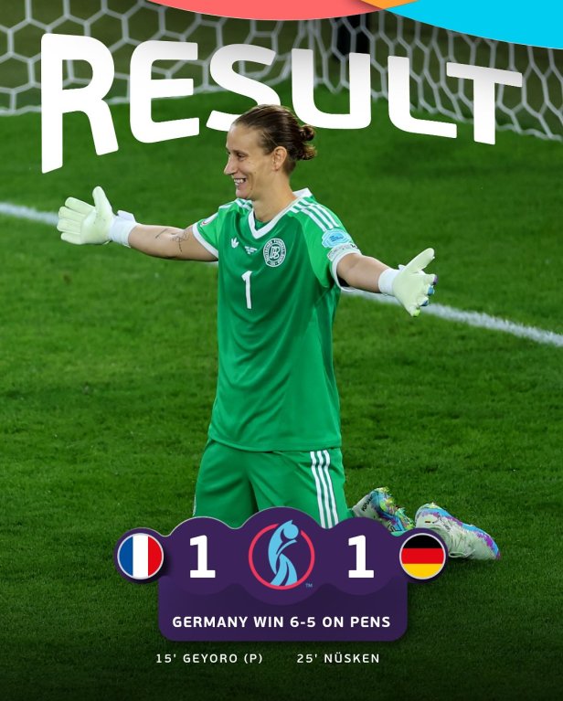 Nos pênaltis, vivemos o oposto do que foi entre Suécia e Inglaterra, não houve festival de pênaltis perdidos, o que valorizou as defesas das goleiras. Nüksen, que errou no tempo normal, converteu o último pênalti à favor da Alemanha. Já a França, viu Berger virar o seu pesadelo, catando a cobrança de Sombath, garantindo as Octacampeãs da Euro nas Semifinais.