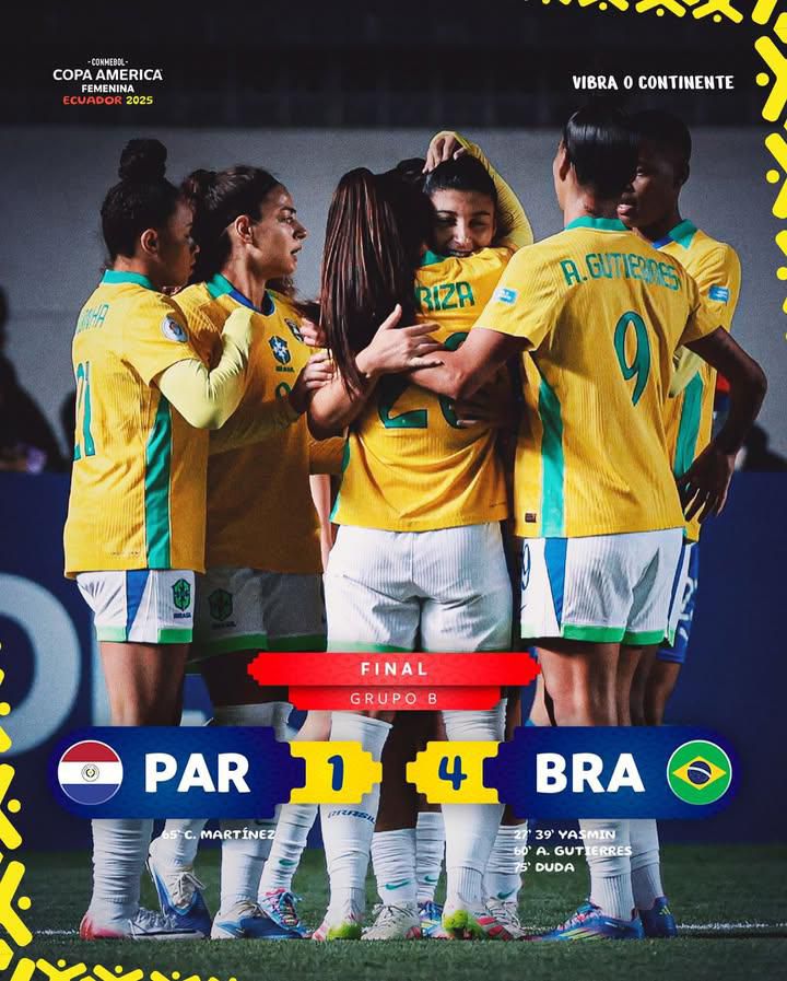 Pela 4ª Rodada da Copa América Feminina, o Brasil sabia que precisava apenas de uma vitória simples para carimbar seu lugar nas Semifinais, entretanto, foi muito além. Ainda no primeiro tempo, com 2 gols de faltas “gêmeos” de Yasmin, praticamente, garantiu os três pontos da partida. No segundo tempo, Amanda Gutierres, que fez gol em todos os jogos, e Duda Sampaio, que fez um golaço, além de ser a melhor da partida, marcaram os outros dois gols da seleção. Claudia Martinez, artilheira do torneio, ainda descontou para as albirrojas, mas nada que diminuísse o grande jogo de nossas meninas.