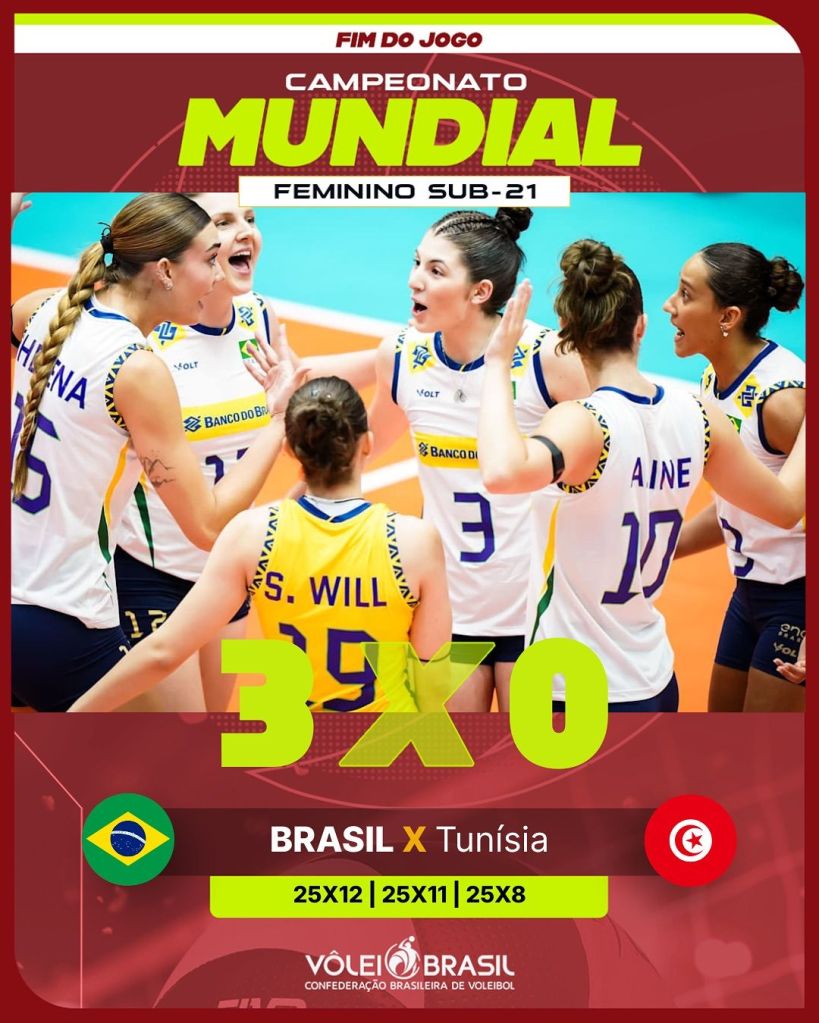 4 jogos e 4 vitórias! A seleção brasileira segue imparável no Mundial Sub-21 de Vôlei Feminino. Diante a Tunísia, vitória tranquila e 100% mantido.