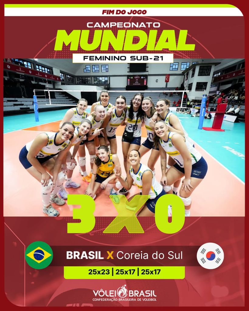 Nas Quartas! Após susto primeiro set, seleção brasileira mostra sua força, vence Coreia do Sul e avança no mundial sub 21.