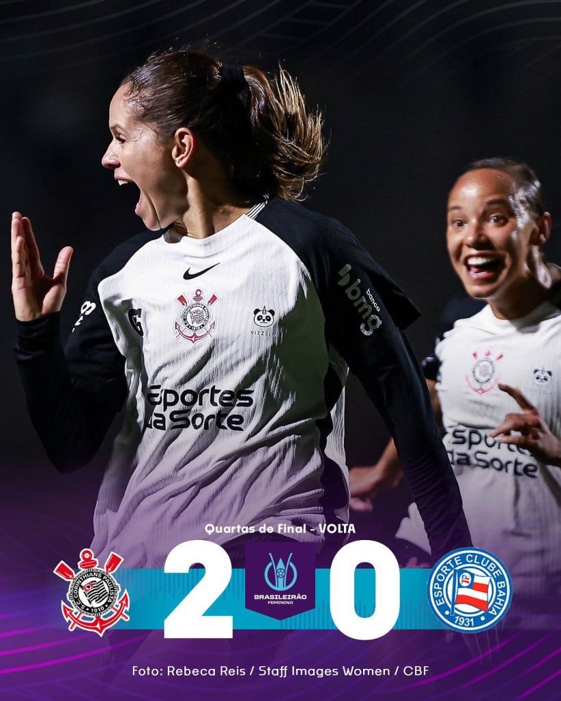 Na Sexta (15), jogando em casa, o Corinthians não vacilou, bateu o valente time do Bahia e garantiu pela 9ª temporada seguida, um lugar entre as 4 melhores do campeonato. Erika e Duda Sampaio marcaram os gol das Brabas.