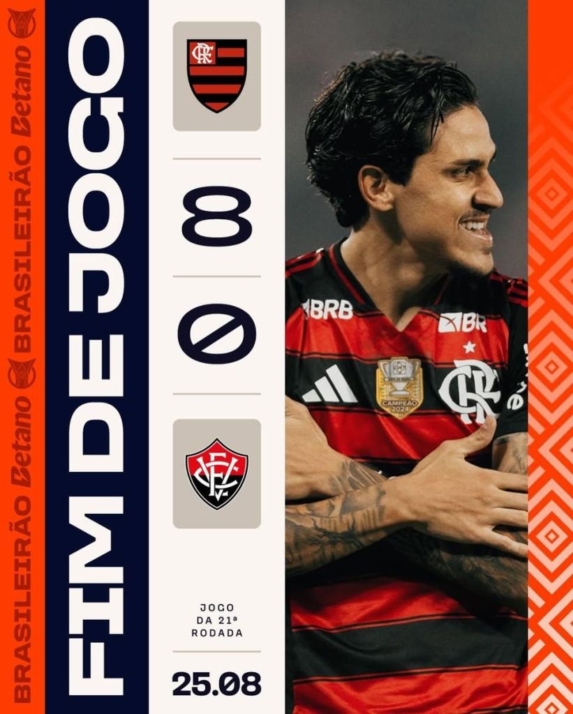 No Maracanã, o Flamengo humilhou o Vitória. Com direito à hat-trick de Pedro, o rubro-negro aplicou a maior goleada do Brasileirão na era dos Pontos Corridos e uma das maiores da história do Brasileirão. Um 8×0, que poderia ter sido até maior. O torcedor que foi ver futebol, viu um espetáculo!