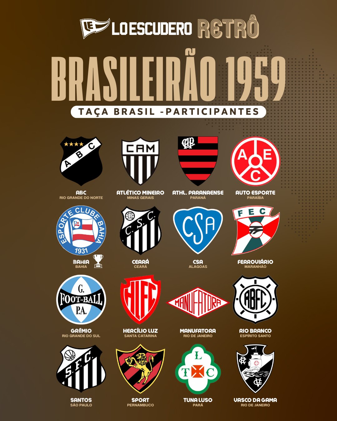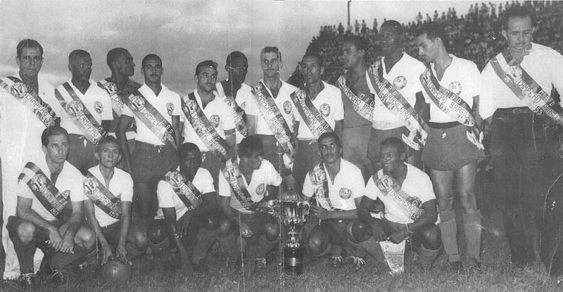 O Primeiro Brasileirão! Apesar da CBF atualizar a lista e adicionar o Brasileirão de 1937, o primeiro torneio 100% Nacional foi a Taça Brasil de 1959. Em uma época que avião era coisa de gente bastante estribada, não existia a possibilidade de existir Torneio por Pontos Corridos ou com várias rodadas entre times do país inteiro. Logo, o torneio de 1959, foi todo disputado no sistema eliminatório e reunindo os campeões dos estaduais.