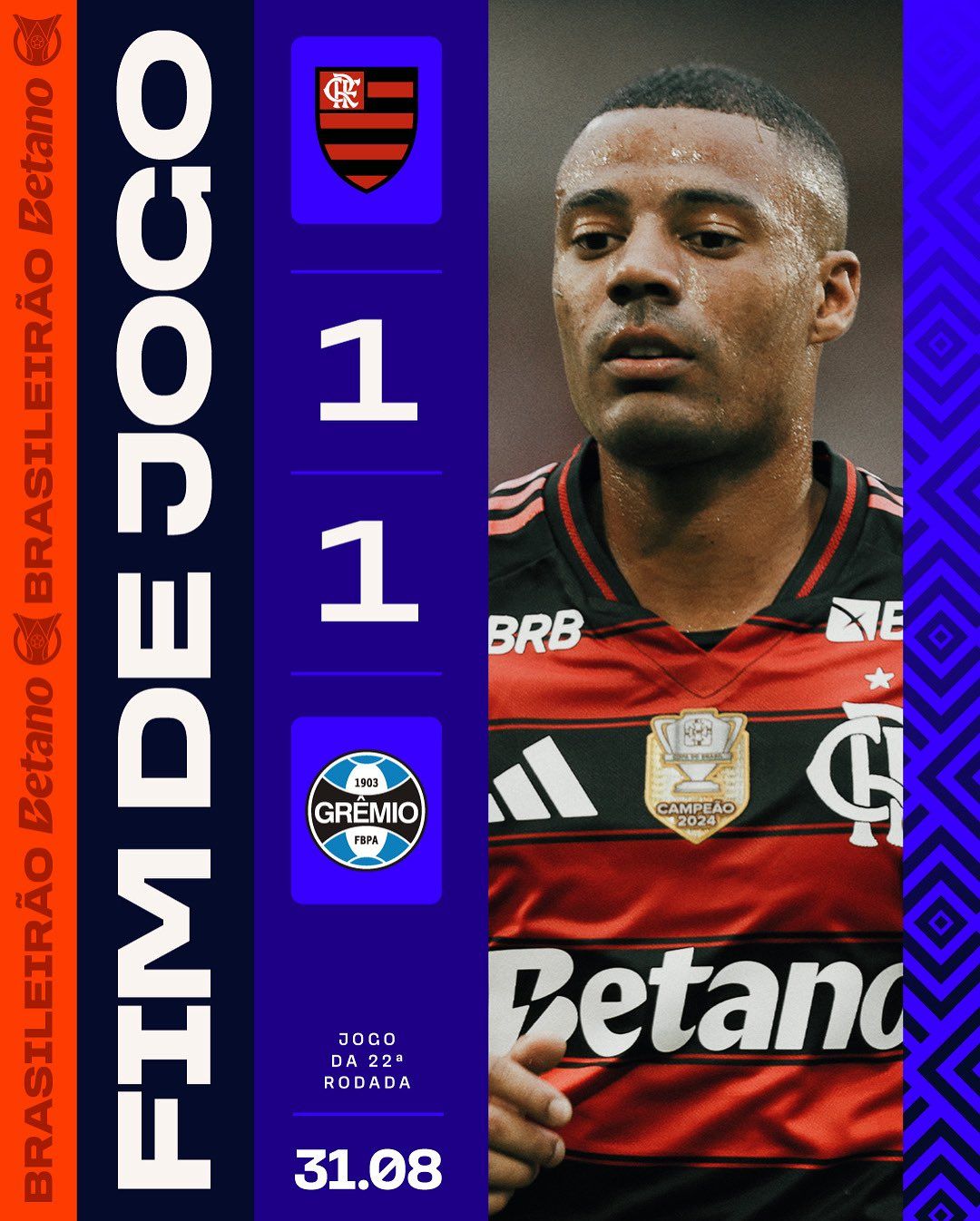 No Maracanã, o Flamengo dominou o jogo, fez o que vem fazendo no campeonato, entretanto diante um time imortal, não se pode dar brecha. O Grêmio, com um jogo com “Cara de Mano”, conseguiu arrancar um empate com o rubro-negro. O Flamengo segue líder, enquanto o tricolor segue perto do Z4, mas mostrando força para não descer.