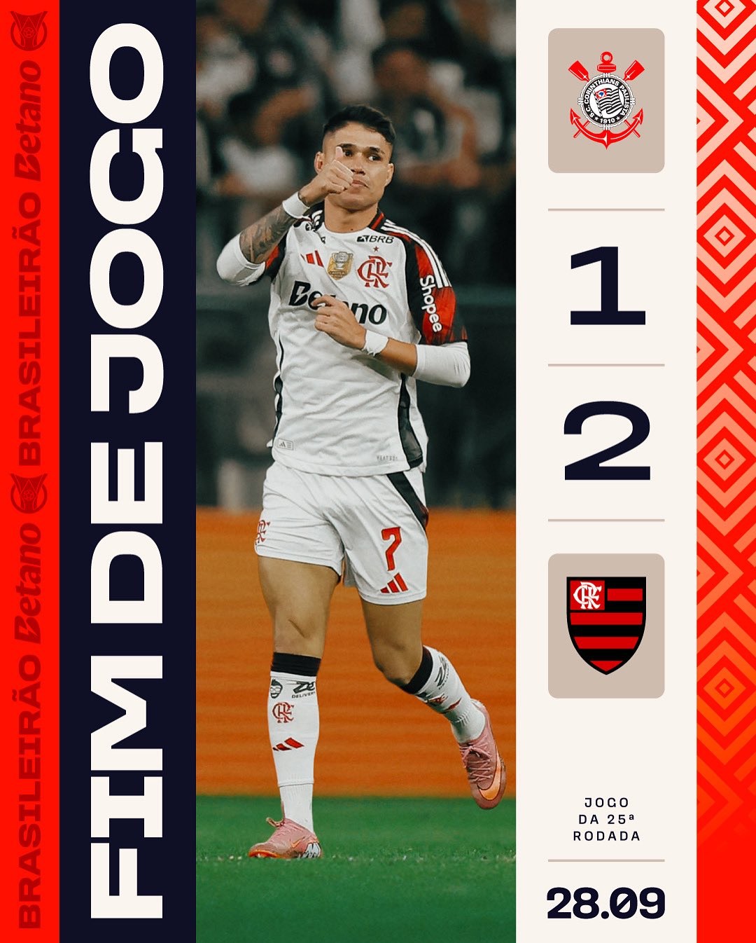 Na Neoquimica Arena, com direito a um dos pênaltis convertidos de maneira mais ridículas da história do Futebol Mundial, o Flamengo superou o Corinthians, de virada, e segue muito líder do Brasileirão. Quem tem Arrasca, tem tudo. Já o Corinthians segue no meio de tabela, porém perdendo o fôlego nos últimos jogos.