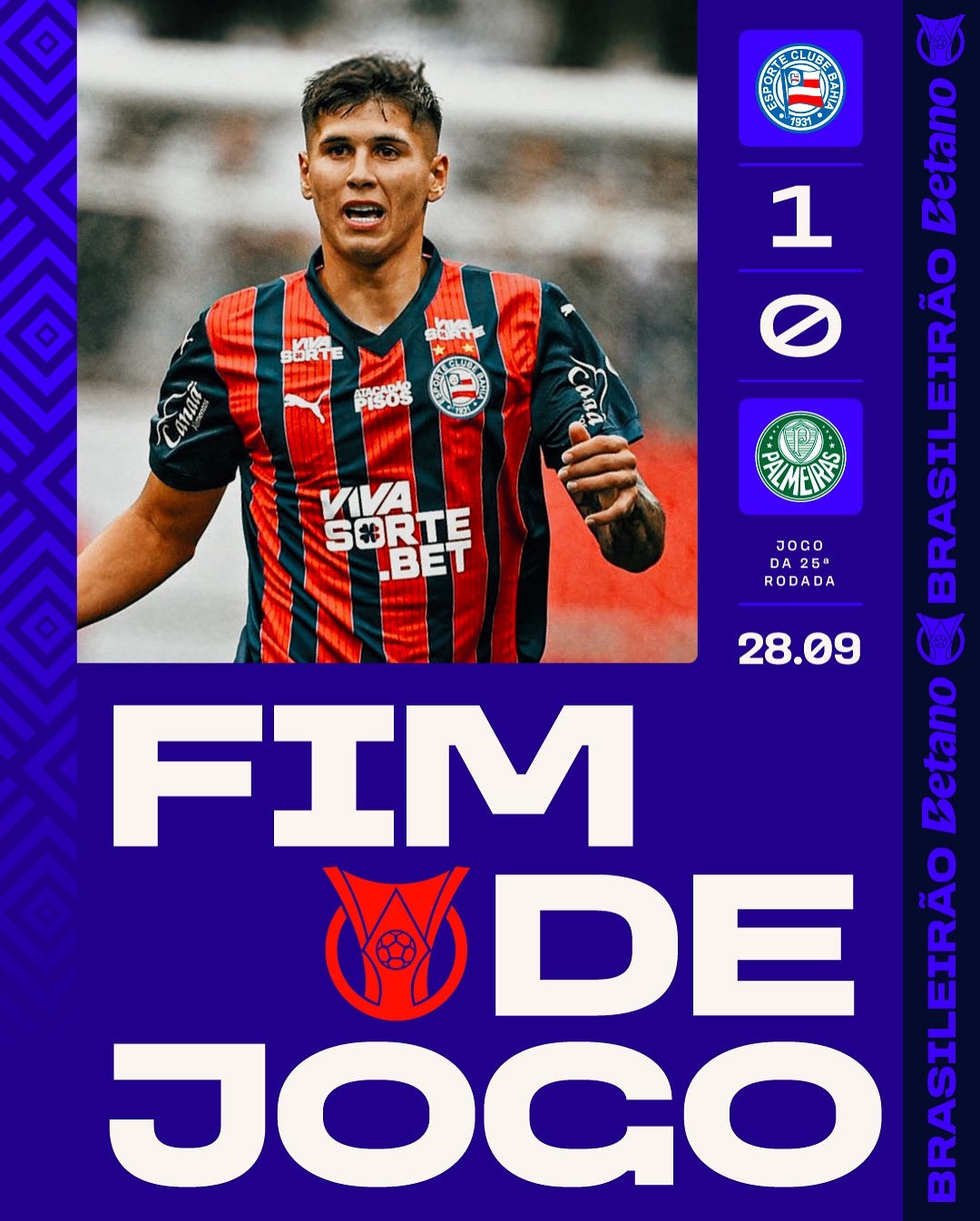 No péssimo gramado da Fonte Nova, Ademir marca golaço e garante triunfo do Bahia sobre o Palmeiras. Além de quebrar a sequência invicta de 11 jogos do Verdão, o tricolor voltou a fungar no cangote do Mirassol e do Botafogo por um lugar no G4. Já o Verdão, apesar da derrota, segue na cola do líder Flamengo.