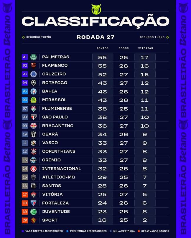 Nos jogos que encerraram a rodada, o Ceará atropelou o Santos, complicando a vida do peixe e se consolidando entre os 10 primeiros. Já o Cruzeiro, em pleno Mineirão, apenas empatou com o Sport e viu sua situação na briga pelo título piorar. Já o Sport conta as rodadas que faltam para o rebaixamento.