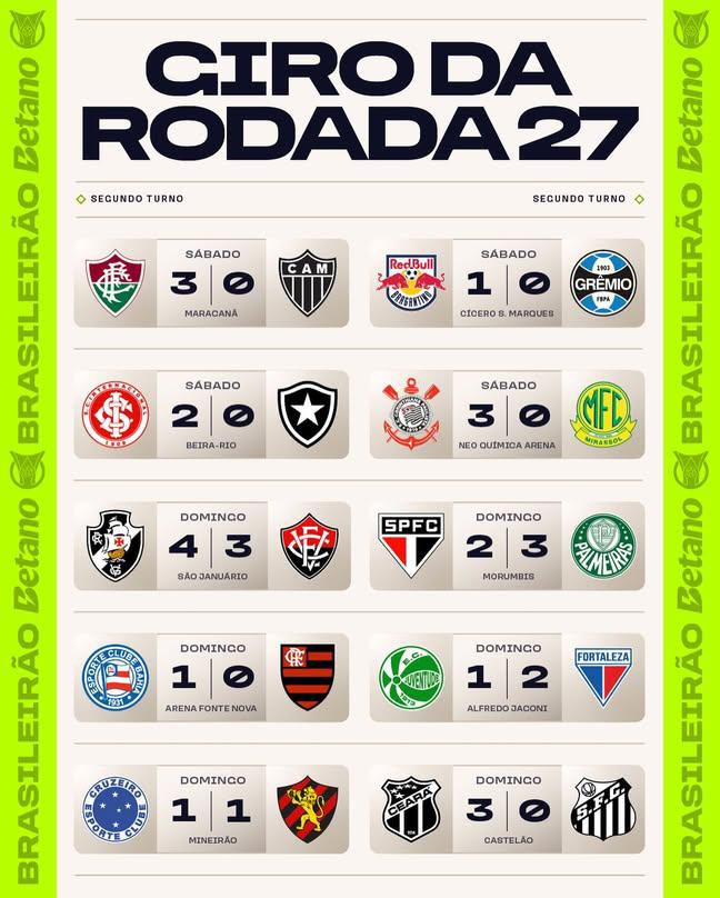 Nos jogos que encerraram a rodada, o Ceará atropelou o Santos, complicando a vida do peixe e se consolidando entre os 10 primeiros. Já o Cruzeiro, em pleno Mineirão, apenas empatou com o Sport e viu sua situação na briga pelo título piorar. Já o Sport conta as rodadas que faltam para o rebaixamento.