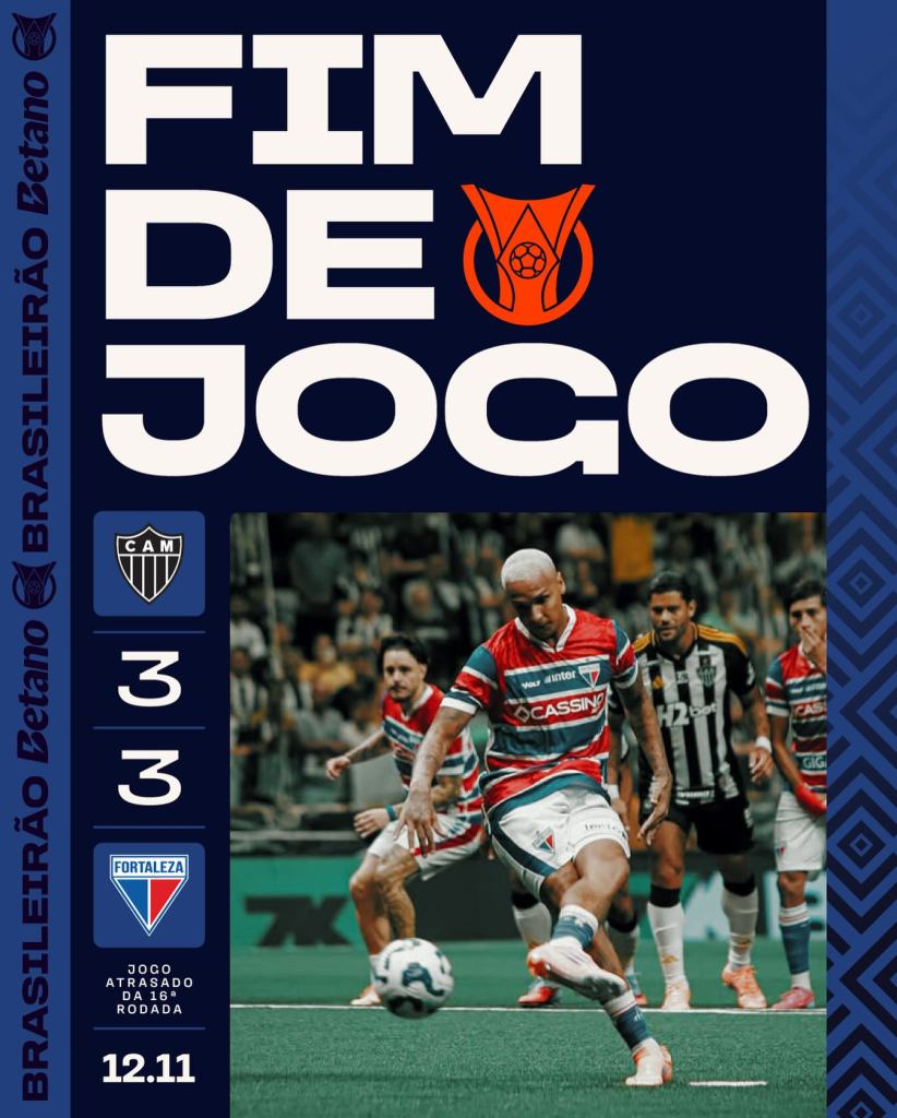 No dia 12 de Novembro, a rodada foi encerrada com direito à Hat-Trick de Deyverson sobre o Atlético Mineiro. Um empate horroroso para Galo e Leão. O Atlético segue com risco de queda, pequena, mas segue, enquanto o Fortaleza segue atolado no Z4.