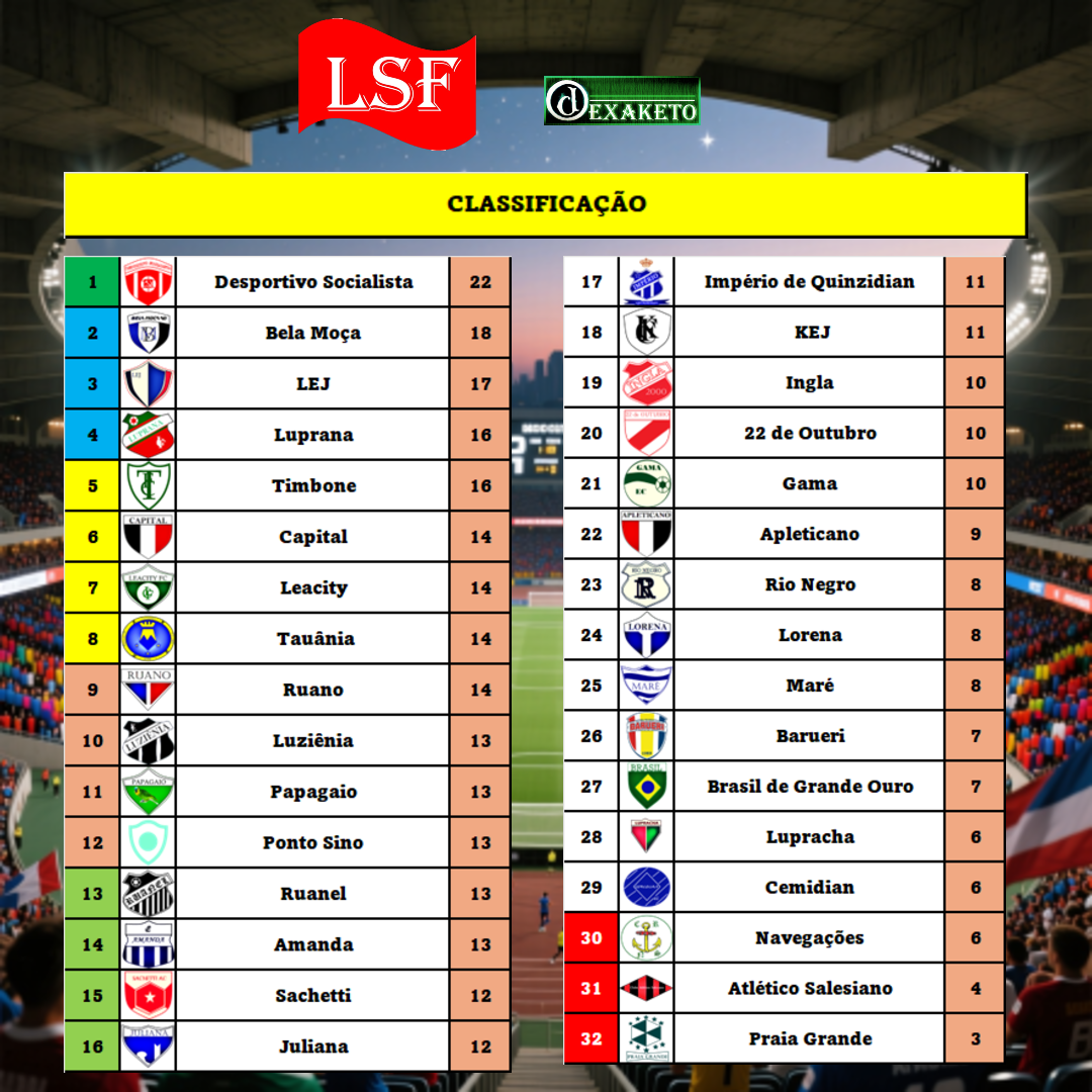 A classificação mantém o Desportivo Socialista na ponta, e agora, bem isolado. Enquanto isso, a disputa segue embolada em todas as posições da tabela.
