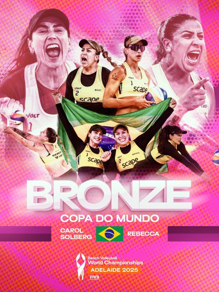 Com uma campanha impressionante, a carioca Carol Solberg e a cearense Rebecca, atletas do Pinheiros, conquistaram a medalha de Bronze do Campeonato Mundial de Vôlei de Praia, que aconteceu em Adelaide, na Austrália. A medalha foi conquistada após vitória diante as brasileiras do AEST, Vic e Thamela por 2×0 (21×18/ 22×20), em um dos grandes jogos deste Campeonato Mundial.
