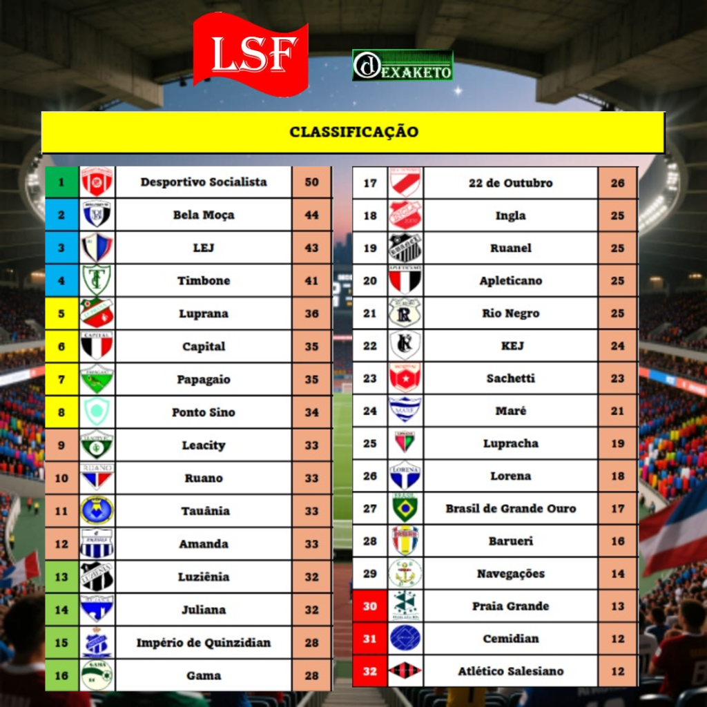 A Classificação virou a melhor amiga do Desportivo Socialista. O time possui 6 pontos à mais que o Bela Moça e segue liderando com sobras. Apesar dos resultados ruins, Bela Moça, LEJ e Timbone seguem “fixos” no Bloco 1. No restante, um equilíbrio absurdo, tanto que a diferença do Luprana (5º) para o Juliana (14º) é de apenas 4 pontos. Na luta contra a degola, houve reação, mas Praia Grande, Cemidian e Atlético Salesiano seguem “fixos” no buraco.