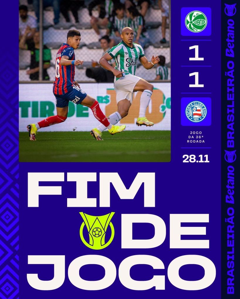 No Jaconi, com direito à golaço de bicicleta anulado, o Juventude empatou com o Bahia e está rebaixado. Enquanto isso, o tricolor baiano não depende apenas de si para chegar na Fase de Grupos da Libertadores.