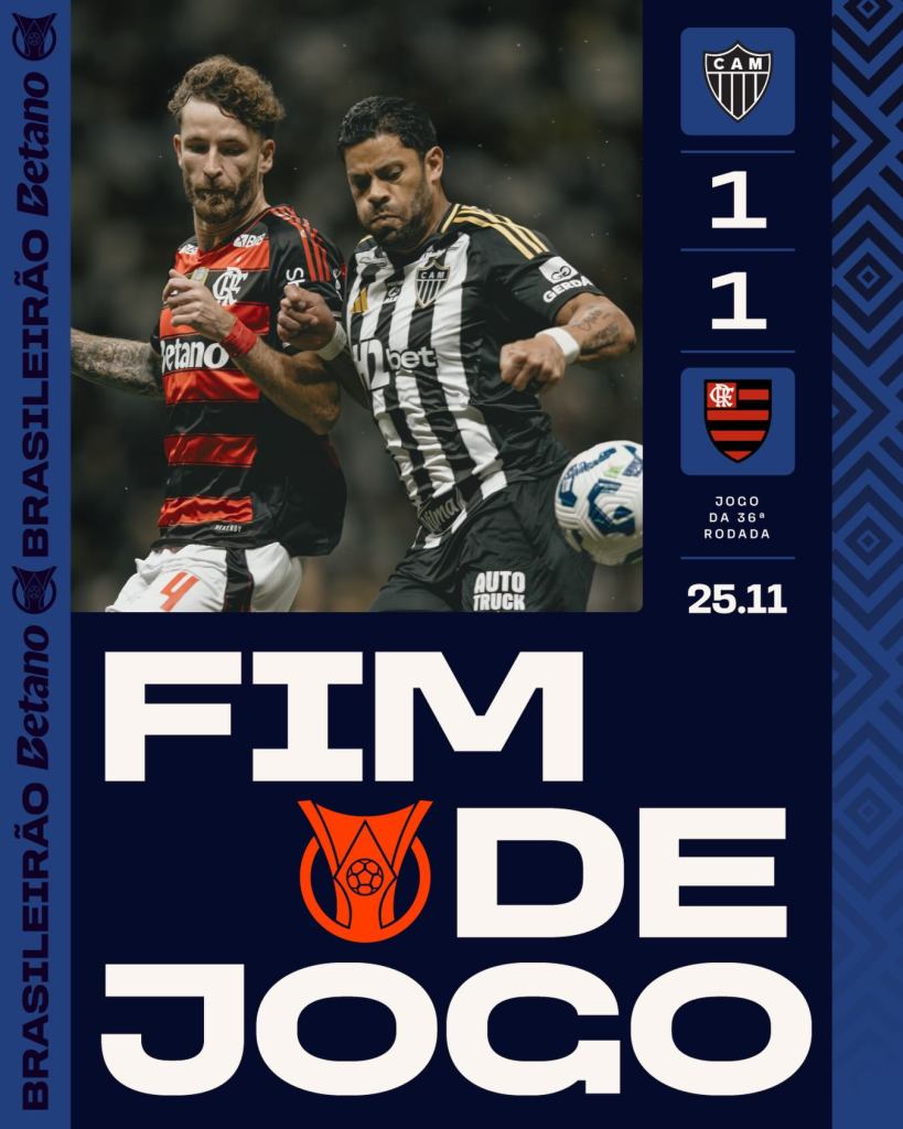 Na Arena MRV, o Atlético Mineiro quase venceu o Flamengo, mas o “virtual” campeão conseguiu empatar com um gol de Bruno Henrique (jogador que não deveria atuar por participar de esquema de manipulação de apostas esportivas, mas se liberaram, problema da justiça) nos minutos finais, e por muito pouco não garantiu o título.