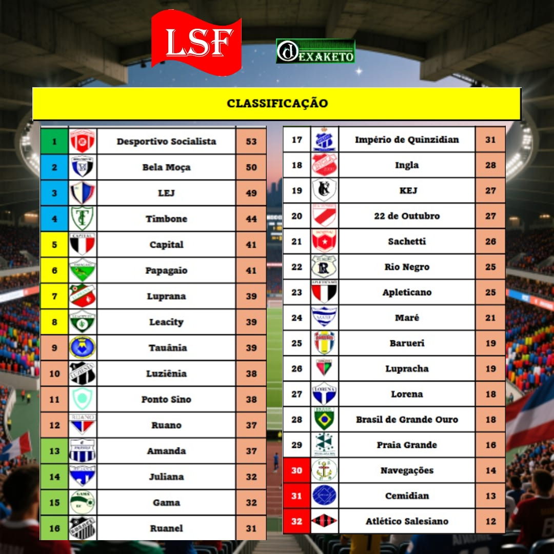 A Classificação segue eletrizante! O Desportivo segue na ponta, porém Bela Moça e LEJ não desgruda. O Timbone não está mais tão sossegado no Bloco 1, muitos times estão só esperando o Timbone derrapar. Na luta contra a degola, nem mesmo a goleada sofrida recolocou o Praia no Z3. Aliás, a luta contra a degola, que parecia não existir mais, ganha força e muita gente ainda corre risco.
