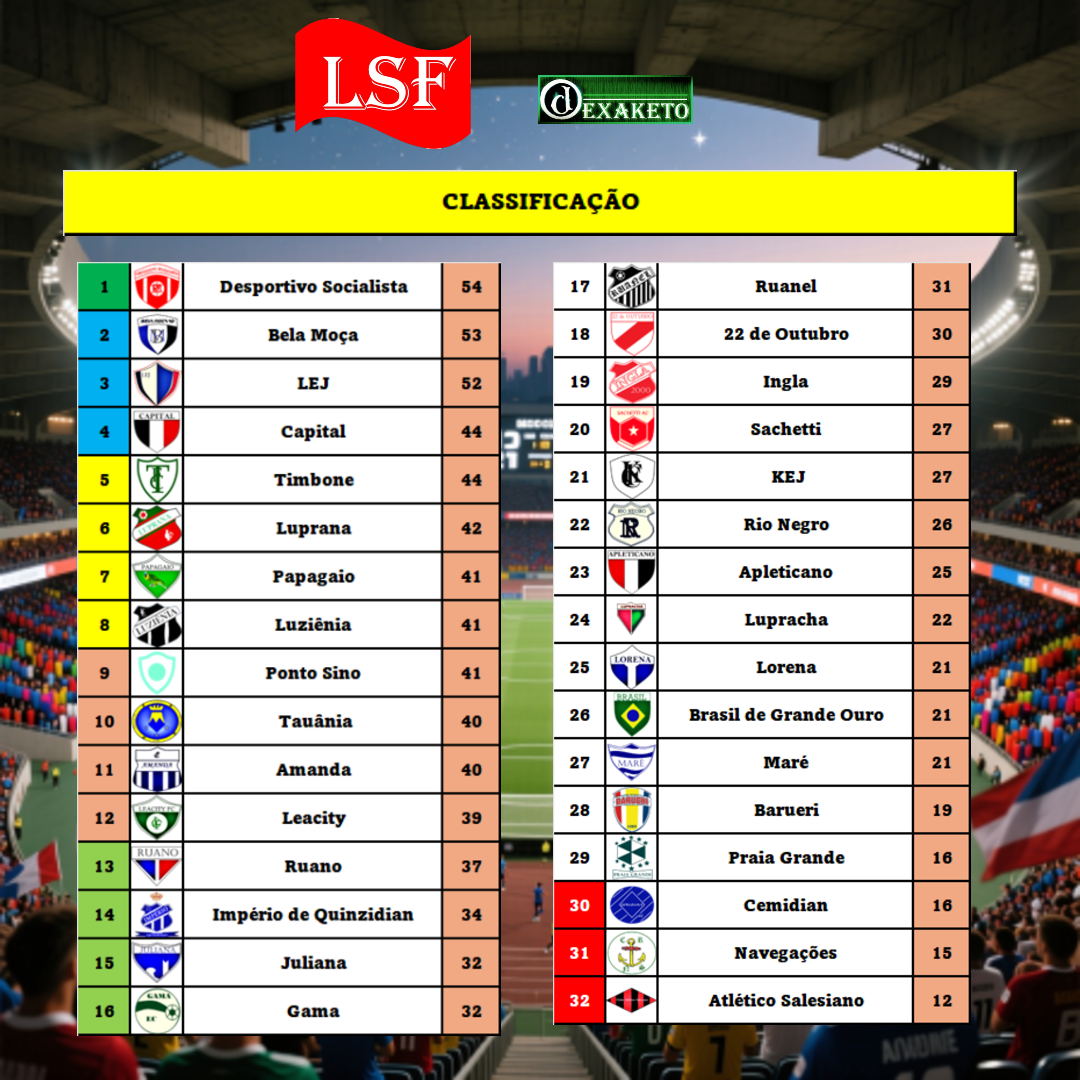A Classificação está dividida entre os que brigam pelo título, os que brigam por um lugar no Bloco 1, os que querem um lugar na Próxima Giuseppe Fiorentino e os que não querem cair para Taça Ouro da LNF.