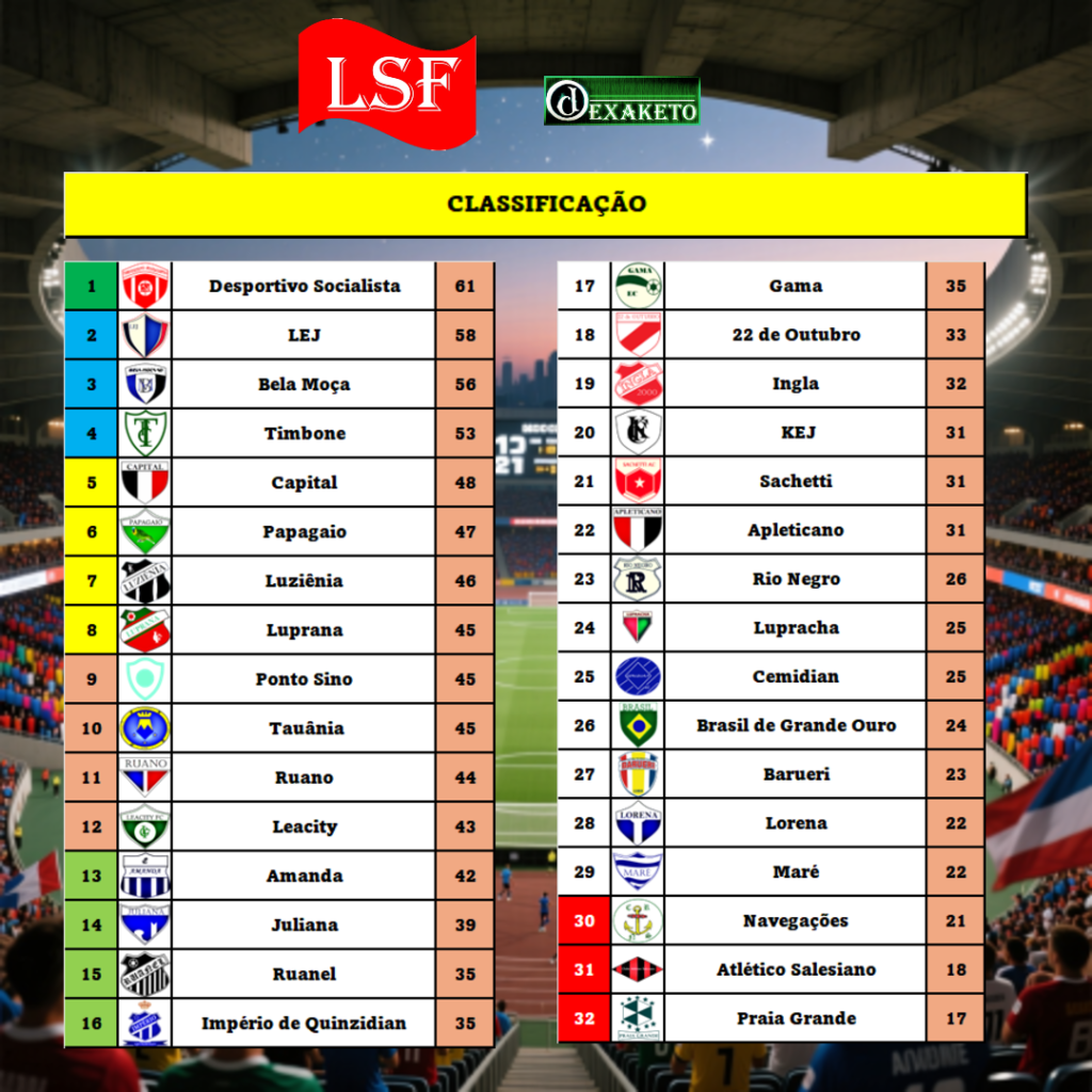 A Classificação nos sinaliza o Desportivo líder com o LEJ na cola, e com o Bela Moça, um pouquinho distante. Uma bola de times entre o Bloco 2 e o Bloco 4. A volta da disputa por um lugar na Taça Giuseppe Fiorentino, além da desesperadora luta contra o “desfiliamento” (rebaixamento)