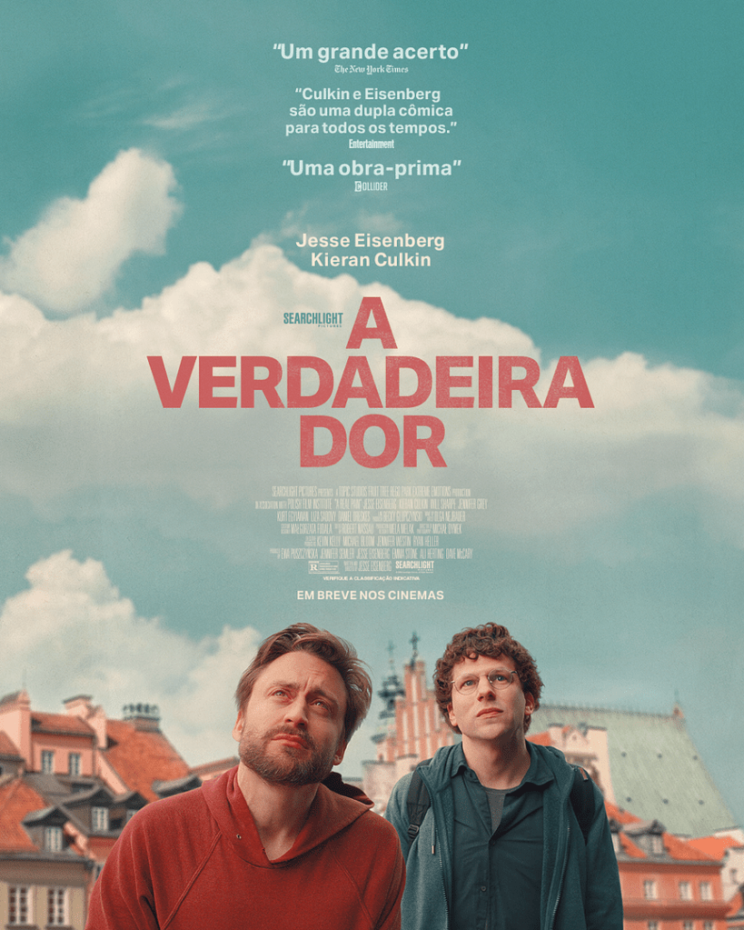 A Verdadeira Dor, com roteiro e direção de Jesse Eisenberg, é uma comédia dramática que explora as complexidades das relações familiares e a busca por identidade. A trama acompanha David (Jesse Eisenberg), um pai reservado e pragmático, e Benji (Kieran Culkin), seu primo excêntrico e boêmio. Apesar de suas diferenças, eles embarcam juntos em uma viagem à Polônia para homenagear a avó recentemente falecida, participando de uma excursão que revisita memórias do Holocausto e conecta o grupo às raízes familiares. Durante a jornada, antigas tensões entre os primos ressurgem, transformando a viagem em uma experiência emocionalmente intensa. À medida que exploram o passado da família e enfrentam as diferenças que os separam, David e Benji são forçados a confrontar suas próprias escolhas e perspectivas de vida. Com momentos de humor e melancolia, o filme oferece uma reflexão profunda sobre memória, legado e reconciliação, equilibrando leveza e emoção em uma narrativa envolvente.