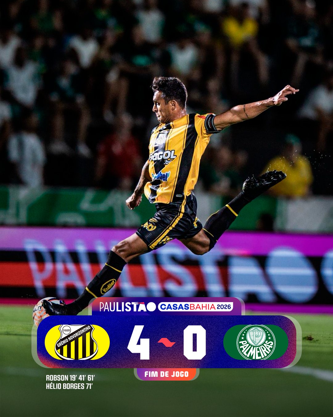 Falando do Palmeiras, um jogo terrível. Tudo deu errado, ninguém jogou bem e a defesa foi apática. Já no Novorizontino, noite inesquecível para Robson, que meteu um hat-trick e fez o torcedor do Palmeiras ficar completamente revoltado. O pior jogo da Era Abel, acredito que sim, e com certeza, o pior resultado.