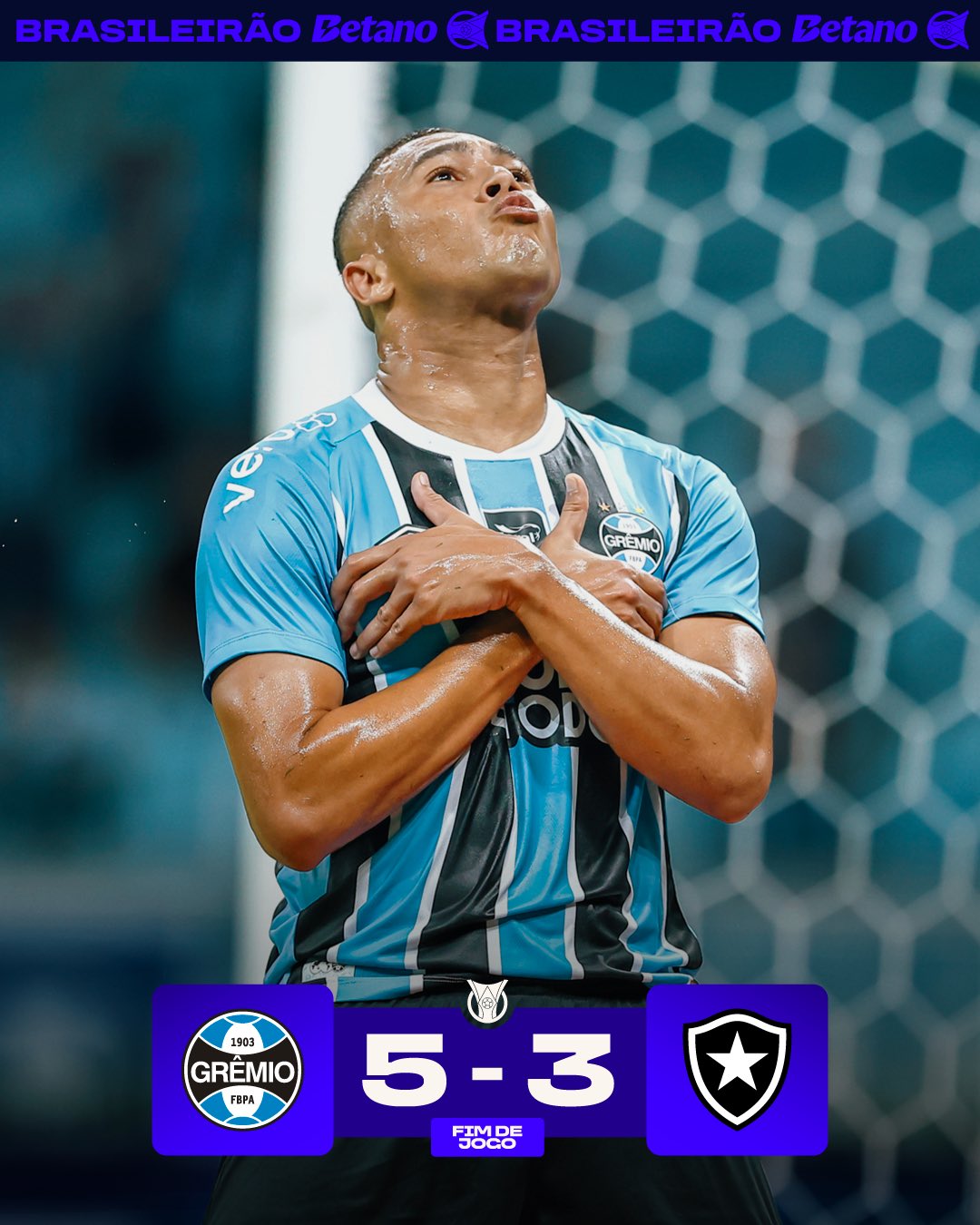 Em Porto Alegre, um jogo muito louco entre Grêmio e Botafogo. Mesmo saindo na frente e com dois gols do artilheiro Danilo, o Grêmio virou e fez a festa, com direito a Hat-trick do super artilheiro Carlos Vinicius.