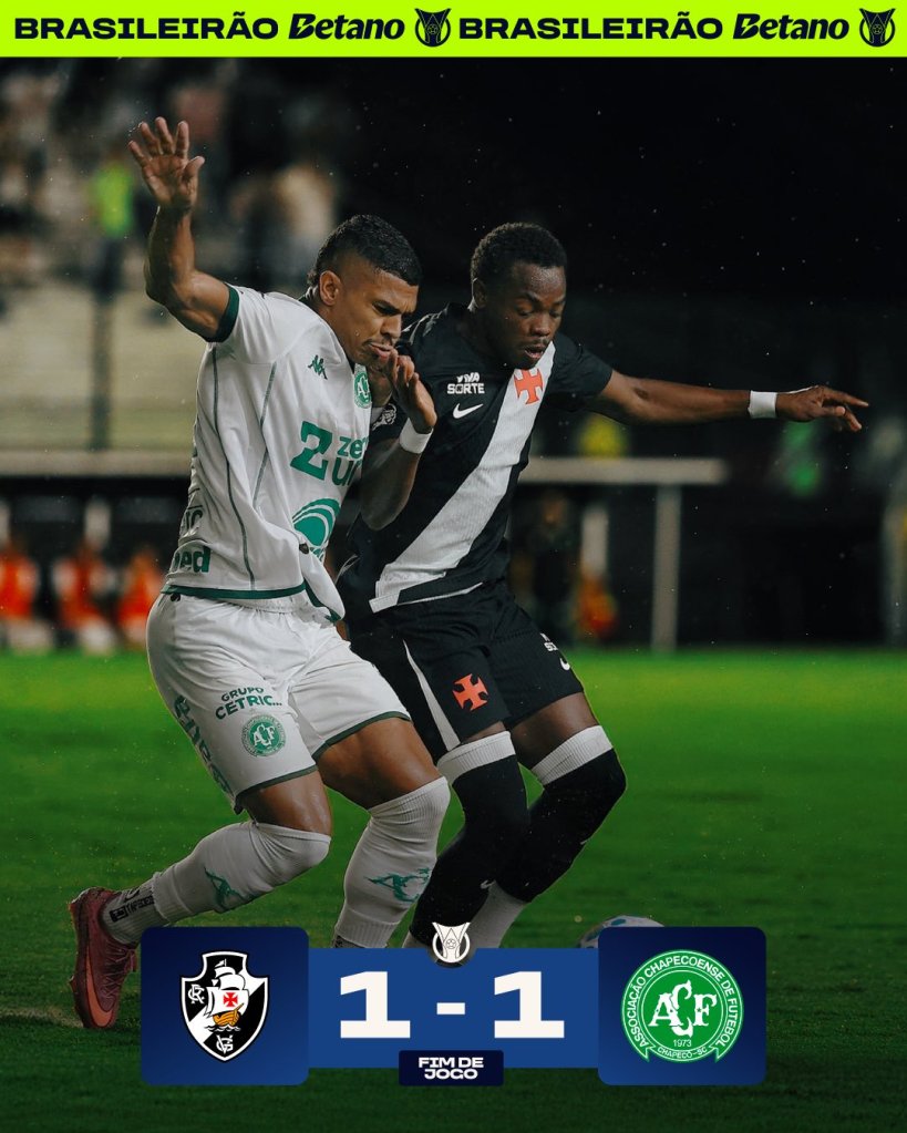 No São Januário, o Vasco parecia que ia ganhar, mas no fim do jogo, com um golaço de falta, a Chapecoense arrancou o empate. A Chape segue invicta, enquanto a torcida do Vasco segue sem paciência com o Fernando Diniz