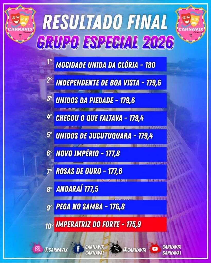 A MUG volta a ser campeã do Carnaval de Vitória, foi o décimo título do Leão da Glória. Enquanto isso, a Imperatriz do Forte desceu à Série Ouro. Veja como ficou a classificação final do Carnaval de Vitória 2026