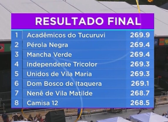 Tucuruvi foi a grande campeã do Grupo de Acesso 1 do Carnaval Paulistano, e junto com a vice-campeã, Pérola Negra, estará no Grupo Especial em 2027. Infelizmente, mais uma vez, a Nenê estará no Grupo de Acesso 2, sendo rebaixada, junto com a Camisa 12. O detalhe fica para a permanência da Mancha Verde, que pela primeira vez, desde 2003, não sobe para o Especial em um desfile do Acesso. A escola da torcida palestrina empatou com a Pérola Negra em pontos válidos, mas perdeu em pontos totais. Enquanto isso, a escola da Vila Madalena, conquistou o segundo acesso consecutivo, retornando ao Especial após alguns anos distante.