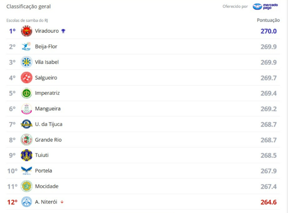 Nesta Quarta(18), em apuração realizada na Cidade do Samba, o resultado do Grupo Especial do Carnaval Carioca foi definido. Viradouro, sem perder nenhum décimo, foi a grande campeã. Beija-Flor, Vila Isabel, Salgueiro, Imperatriz e Mangueira voltam no sábado das campeãs. A Niterói foi a rebaixada.