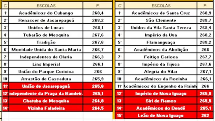 Após uma longa apuração (36 notas de 29 escolas é muita coisa!), a Acadêmicos do Santa Cruz confirmou o título e o seu retorno à Marquês da Sapucaí. Como definido em regulamento, as 4 piores por noite, seriam rebaixadas. Logo caíram: Império de Nova Iguaçu, União de Jacarepaguá, Siri de Ramos, Independente da Praça da Bandeira, Acadêmicos do Dendê, Chatuba de Mesquita, Vizinha Faladeira e Leão de Nova Iguaçu.